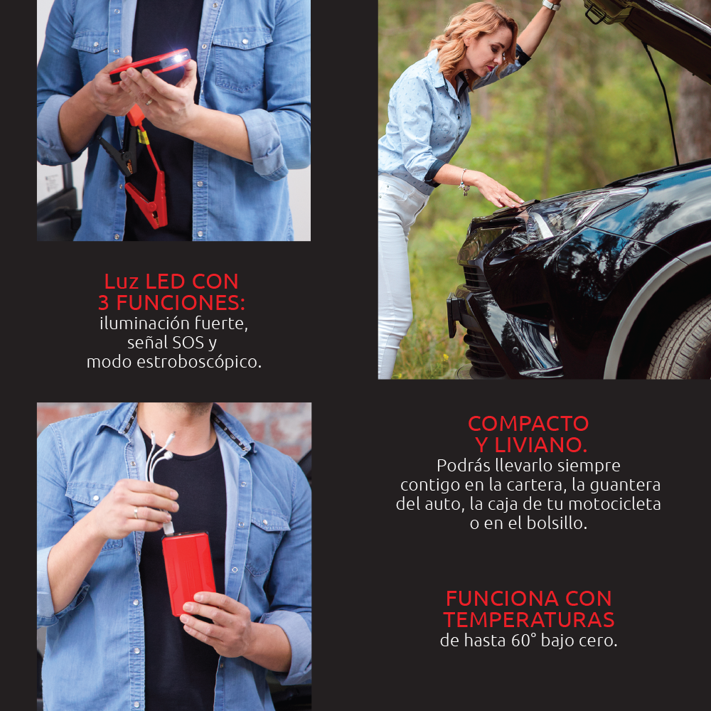 Sin cables, sin grúas, sin estrés. Además cargas tu celular y usas su linterna LED en emergencias. Siempre contigo, en la guantera o mochila.