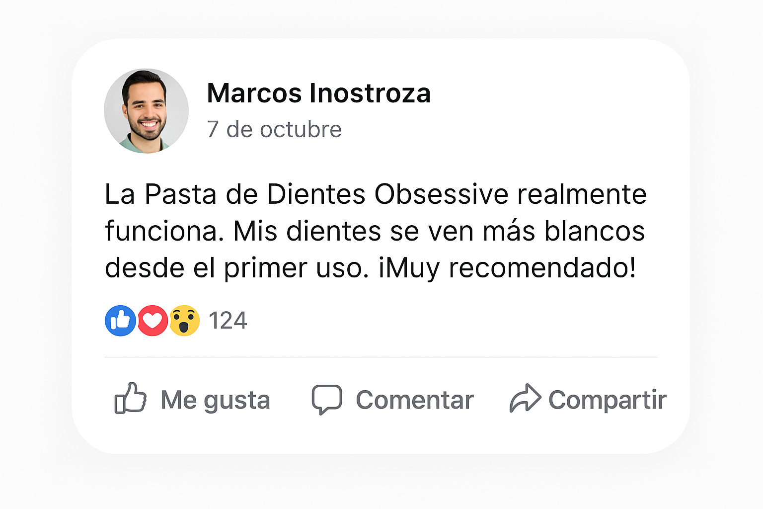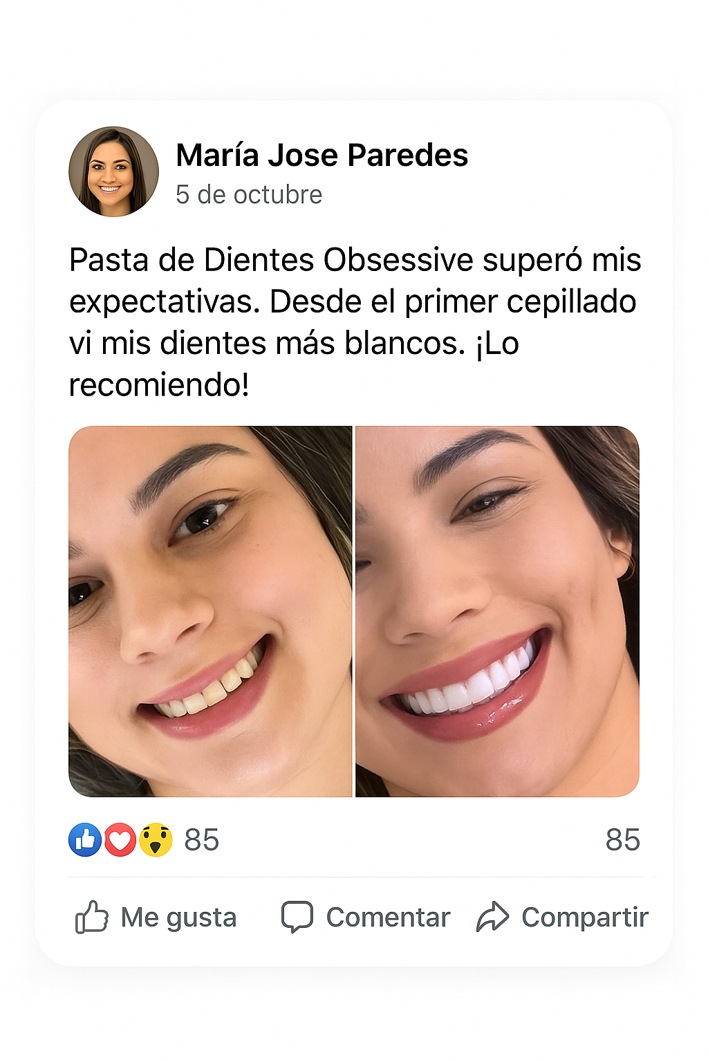Obsessive™ corrige el tono amarillento y blanquea tus dientes al instante, sin químicos agresivos ni dolor.