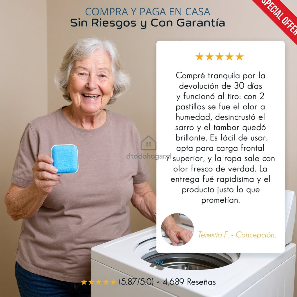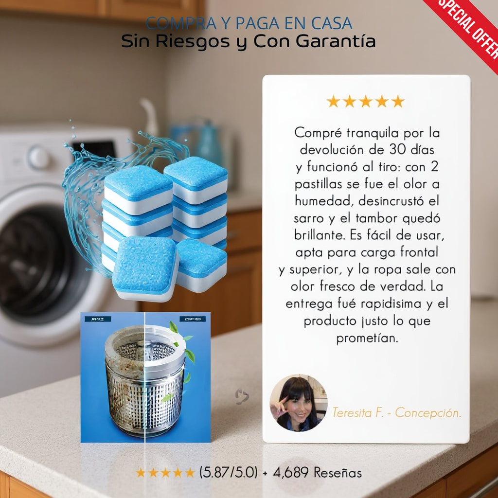 Con Lavafix Tabs™ elimina sarro, moho y bacterias desde el interior de tu lavadora, manteniéndola como nueva con solo 1 pastilla al mes.