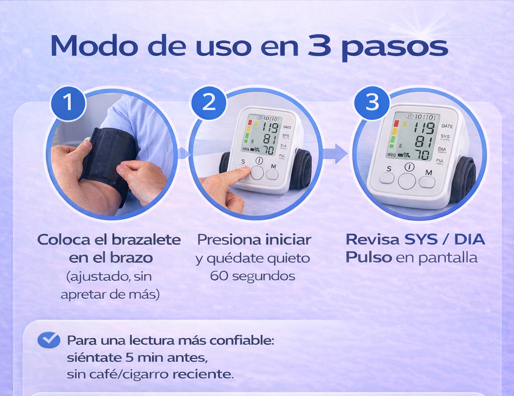Con un solo botón, mide presión sistólica, diastólica y pulso de forma automática.